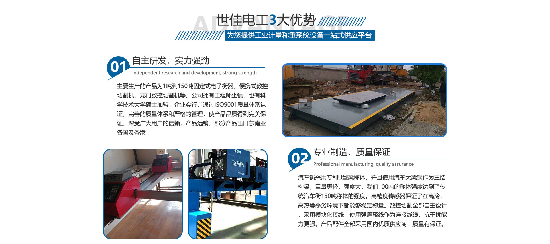 合肥世佳電工設備有限公司是生產、銷售工業自動化設備。主要生產的產品為1噸到150噸固定式電子衡器,便攜式數控切割機,龍門數控切割機等。公司擁有工程師坐鎮,也有中國科學技術大學碩士加盟,完善的質量體系和嚴格的管理,使產品品質得到保證,深受廣大用戶的信賴,產品各地可售,部分產品出口東南亞各國及香港,數控切割設備也在安徽處于前列。我們并不滿足現在所取得的成就,公司繼續加大科研投入,正在和中科大物理研究所科研人員共同研究開發下一代衡器控制儀表,希望以技術作為突破口,將公司做大做強,為中華崛起盡自己一份綿薄之力。歡迎廣大客戶來廠參觀訂貨考察。